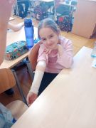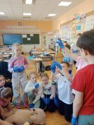 Uczniowie nie tylko dowiedzieli się na czym polega praca pielęgniarki i jak należy dbać o higienę, ale także zapoznali się ze sprzętem medycznym, wykorzystywanym na co dzień w szpitalu. Dzieci miały okazję zobaczyć stetoskop, kroplówkę (nawet metodę jej działania), probówkę, ciśnieniomierz, termometr, itp. Dowiedziały się też, co to jest staza, jakie są różne rodzaje opatrunków, plastrów, bandaży i jak prawidłowo ściągać rękawiczki. Wszystkie te sprzęty dzieci wykorzystały praktycznie. Wykonywały też doświadczenie ze strzykawką oraz doświadczenie ukazujące bakterie na naszym ciele. Serdecznie dziękujemy Pani Kasi za poświęcony czas, zaangażowanie, profesjonalizm i włożone serce w przeprowadzenie tak atrakcyjnych zajęć dla dzieci! ![]()