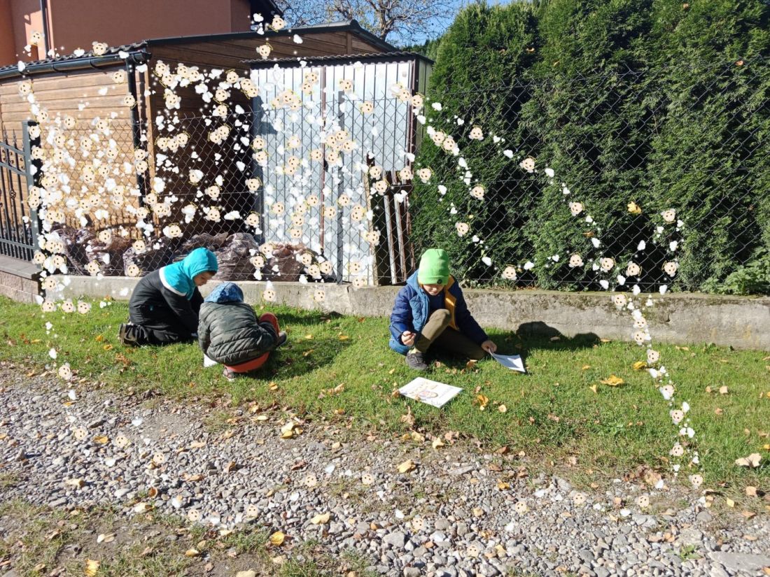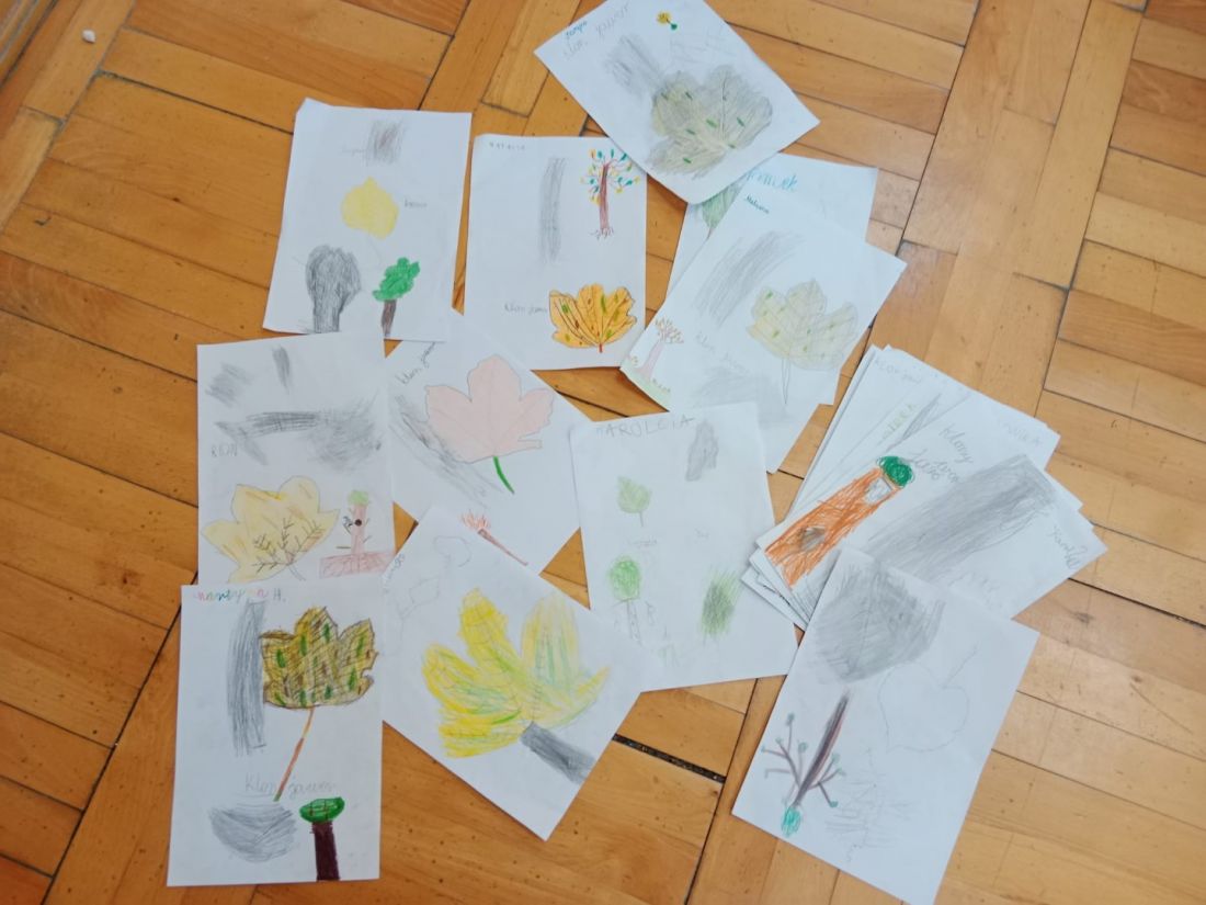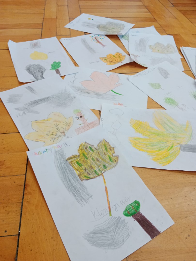 Podczas spaceru dzieci obrysowywały korę i liście drzew. Była to doskonała okazja do nauki o różnorodności drzew i rozwijania umiejętności obserwacji.