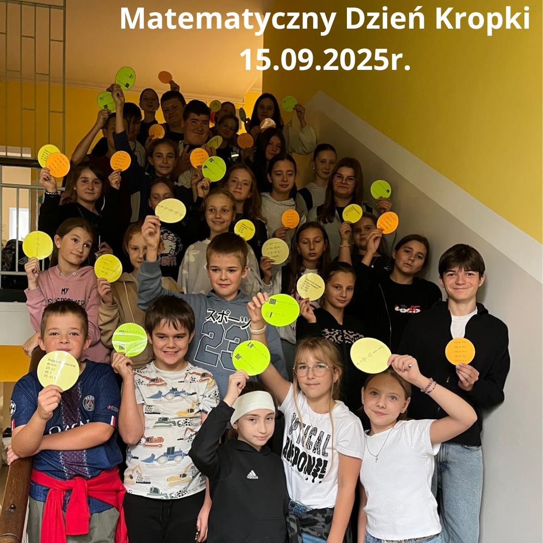 15 września 2025 roku obchodziliśmy Międzynarodowy Dzień Kropki z matematyką. Z okazji tego święta zorganizowany został konkurs dla wszystkich uczniów klas 4-8, który polegał na znalezieniu odpowiednich kropek z zadaniami w całej szkole, rozwiązaniu podanych tam zadań w odpowiedniej kolejności oraz przeniesieniu rozwiązań na kartę odpowiedzi.