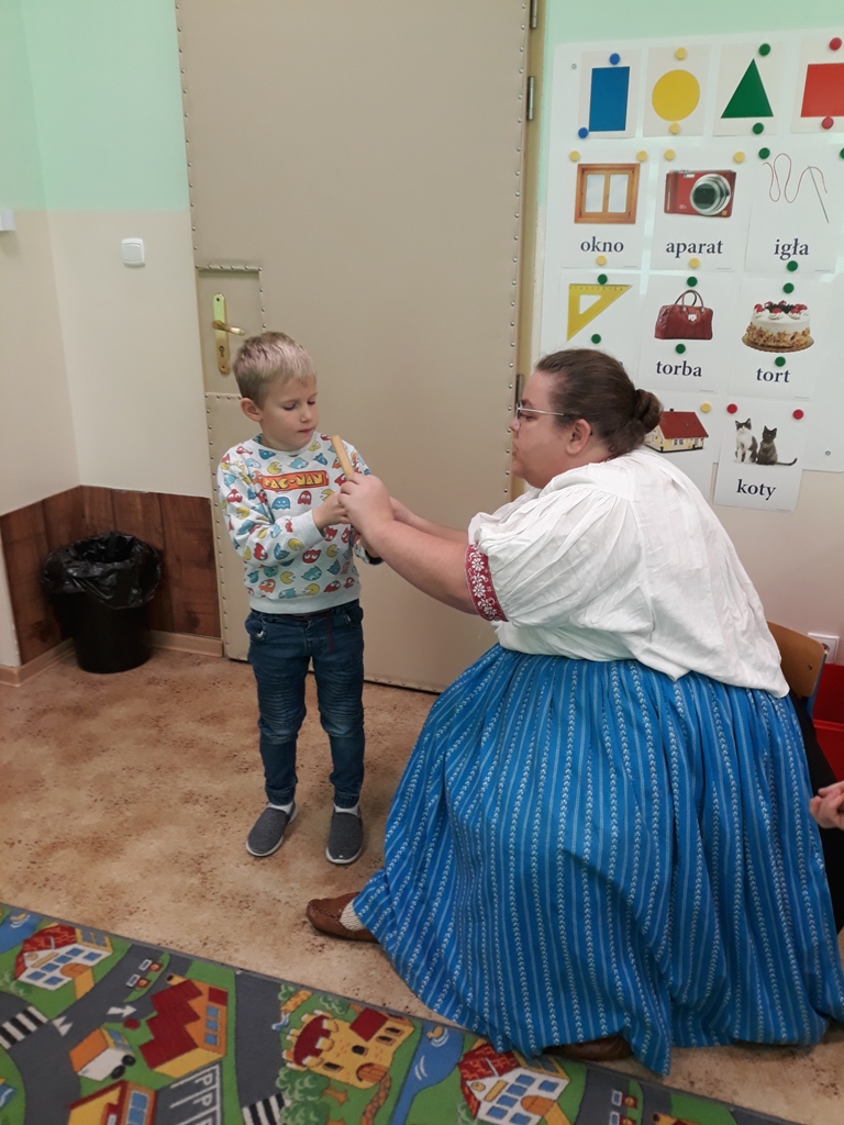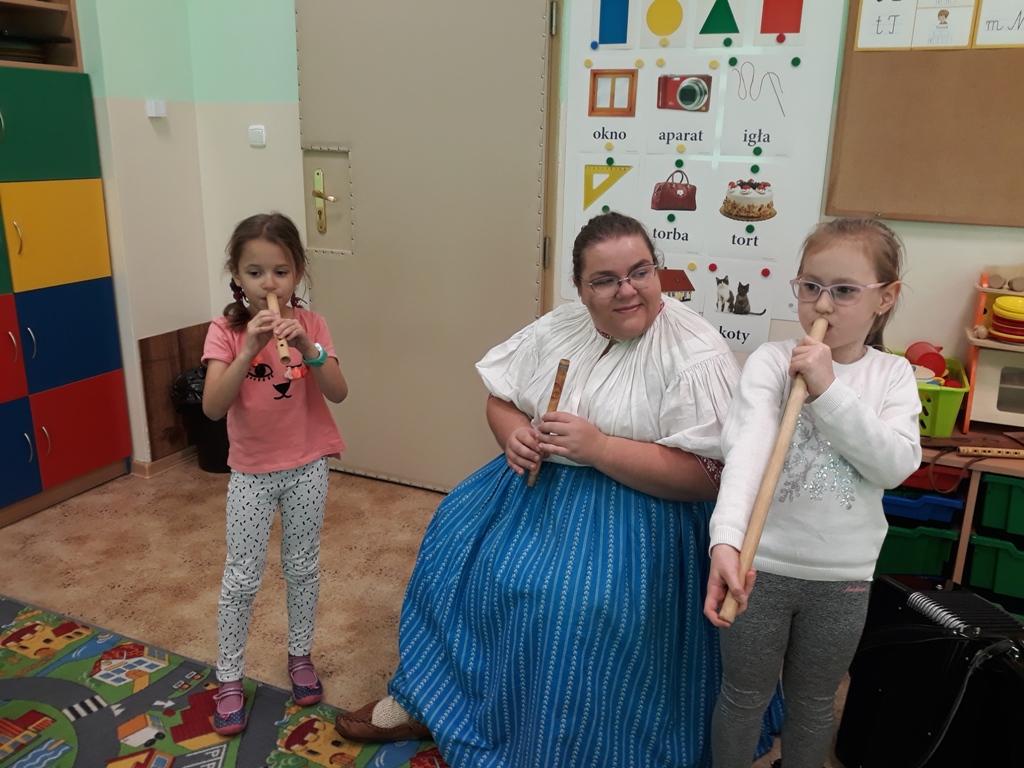 W piątek, 15.11.2019r. gościliśmy w oddziałach przedszkolnych Kierownika Dziecięcego Zespołu Regionalnego „Mała Brenna” – Panią Annę Musioł. Tematem spotkania było: „Dawne życie dzieci górali Beskidu Śląskiego”. Pani Ania w atrakcyjny sposób, gwarą naszego regionu ukazała dzieciom piękno sztuki ludowej: tańca, muzyki, stroju ludowego. Pokazała dawne, zabawy dzieci, najprostsze instrumenty muzyczne – piszczołki, na których dzieci miały okazję zagrać proste dźwięki, posłuchaliśmy przyśpiewek, piosenek ludowych. Spotkanie sprawiło dzieciom wiele radości i przyczyniło się do kształtowania postaw patriotycznych, przynależności do swojego regionu i miłości do MAŁEJ OJCZYZNY.
