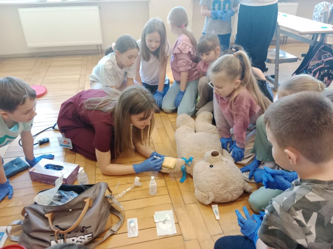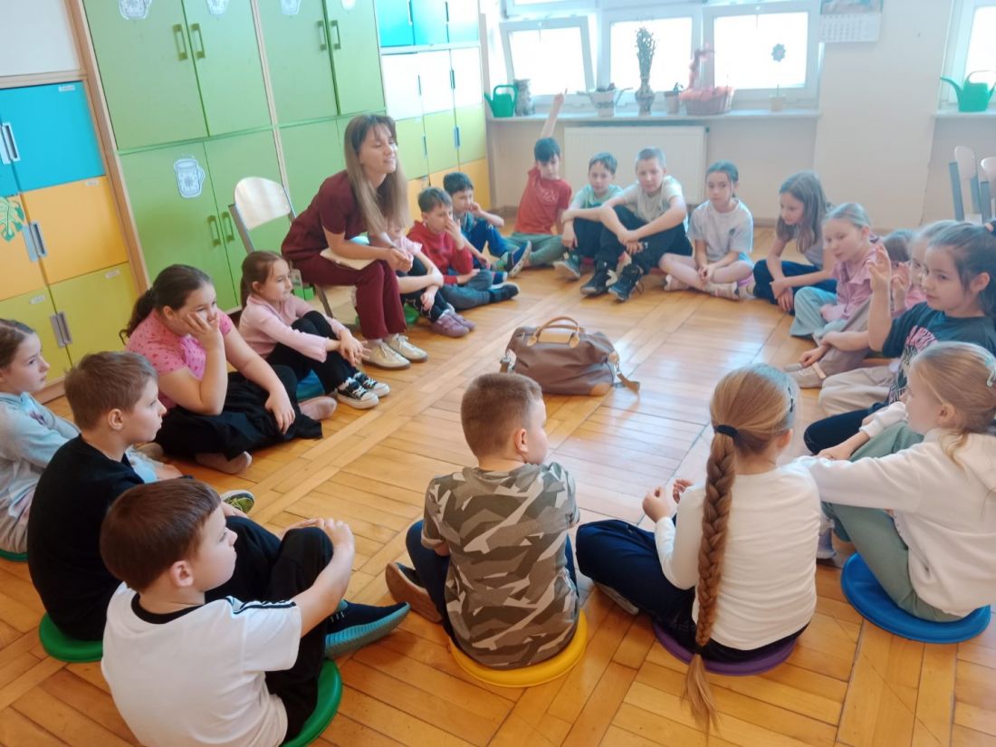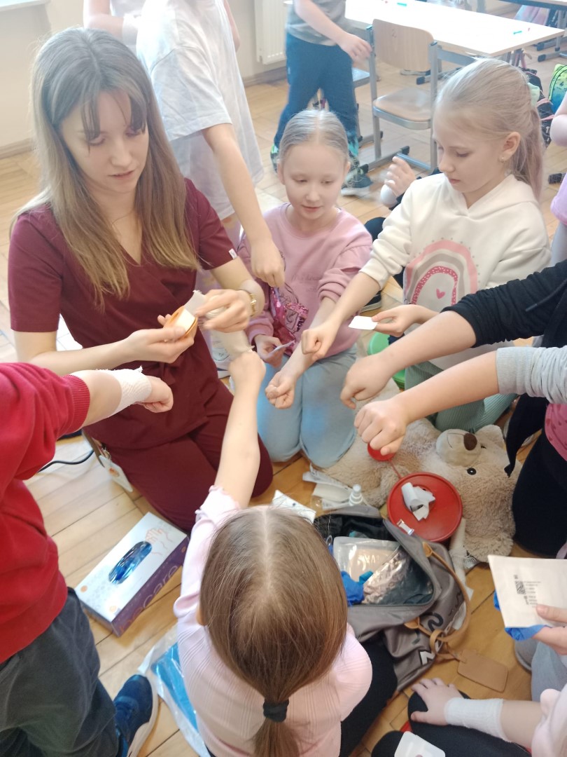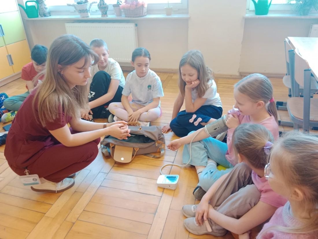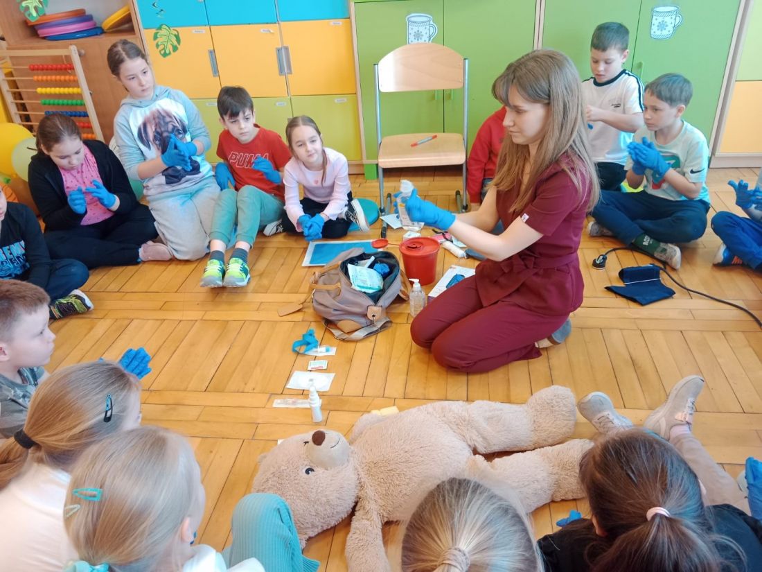 A wszystko to za sprawą pani pielęgniarki Kasi, cioci Lilianki, która była gościem klasy 2a. Pani Kasia na co dzień pracuje w szpitalu. Z dziećmi podzieliła się swoim doświadczeniem zawodowym, uchyliła im rąbka tajemnicy pielęgniarki.