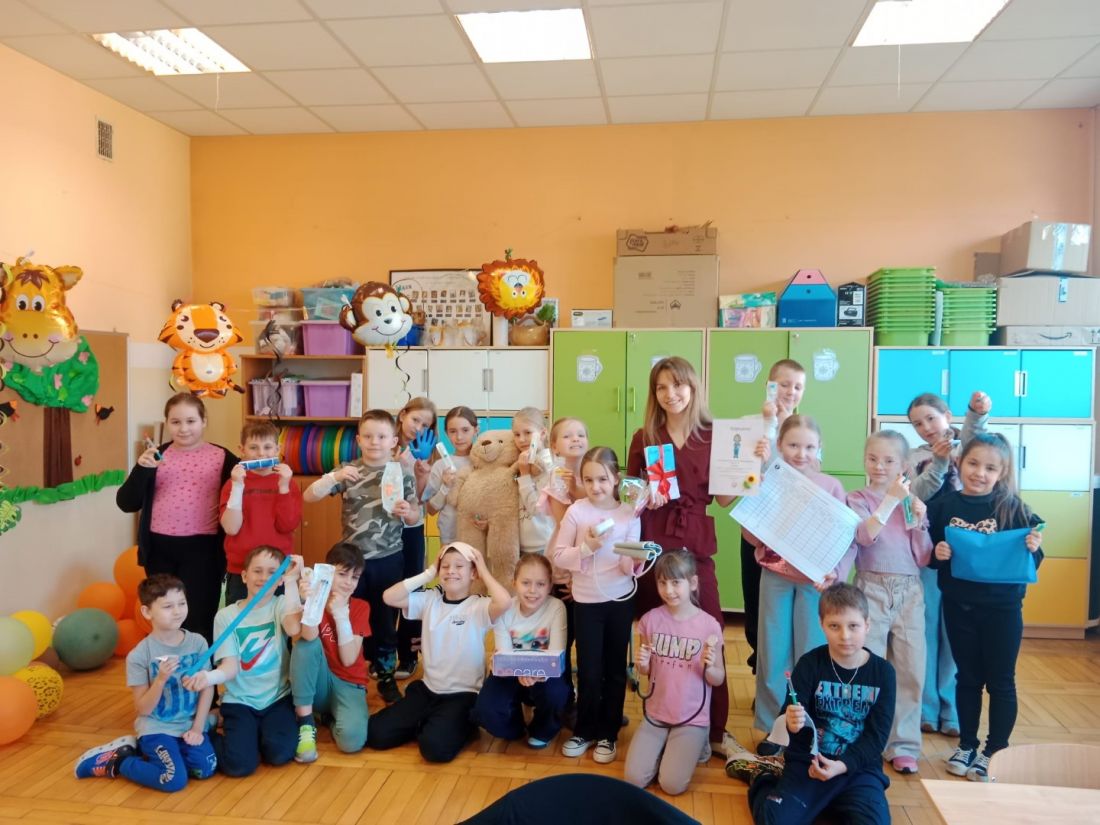 Uczniowie nie tylko dowiedzieli się na czym polega praca pielęgniarki i jak należy dbać o higienę, ale także zapoznali się ze sprzętem medycznym, wykorzystywanym na co dzień w szpitalu. Dzieci miały okazję zobaczyć stetoskop, kroplówkę (nawet metodę jej działania), probówkę, ciśnieniomierz, termometr, itp. Dowiedziały się też, co to jest staza, jakie są różne rodzaje opatrunków, plastrów, bandaży i jak prawidłowo ściągać rękawiczki. Wszystkie te sprzęty dzieci wykorzystały praktycznie. Wykonywały też doświadczenie ze strzykawką oraz doświadczenie ukazujące bakterie na naszym ciele. Serdecznie dziękujemy Pani Kasi za poświęcony czas, zaangażowanie, profesjonalizm i włożone serce w przeprowadzenie tak atrakcyjnych zajęć dla dzieci! ![]()