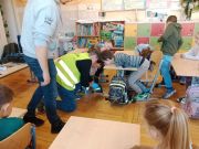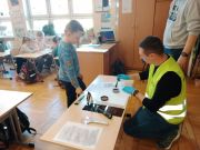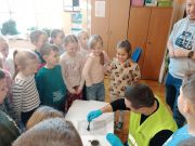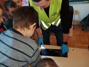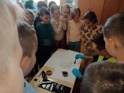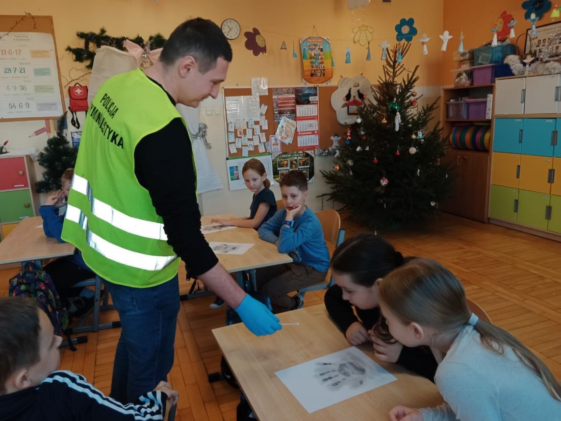 Dzieci odbyły pogadankę n.t. pracy policjanta w tym wydziale i poznali jej specyfikę. Największą atrakcją cieszył się pokaz sprzętu wykorzystywanego przez policjantów w kryminalistyce. Uczniowie mieli okazję szukać śladów za pomocą latarki, odbijać odciski butów na taśmie, a także odbijać swoje linie papilarne na dłoni za pomocą specjalistycznego sprzętu.