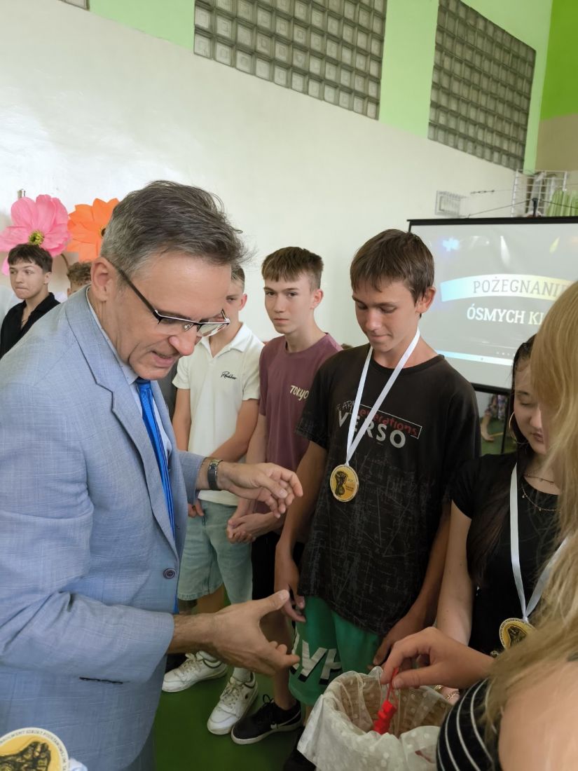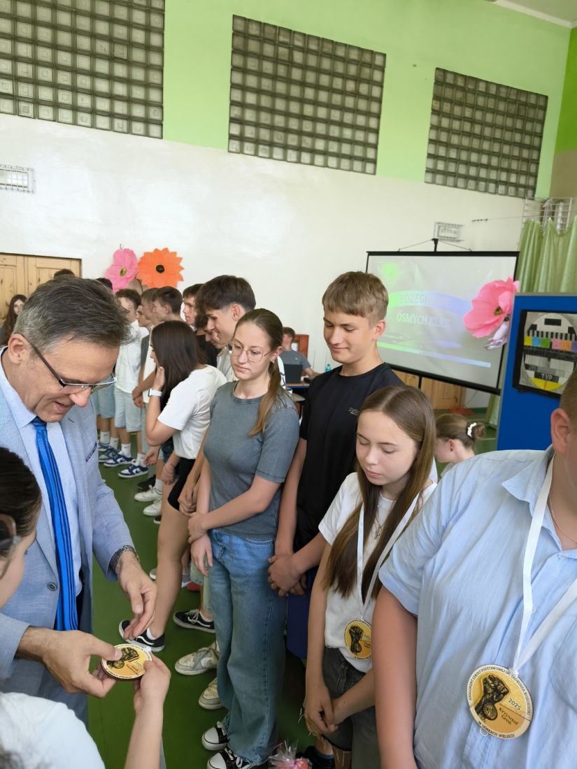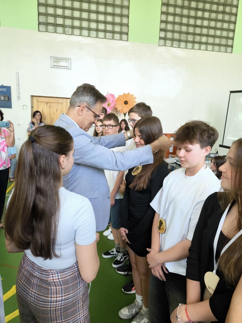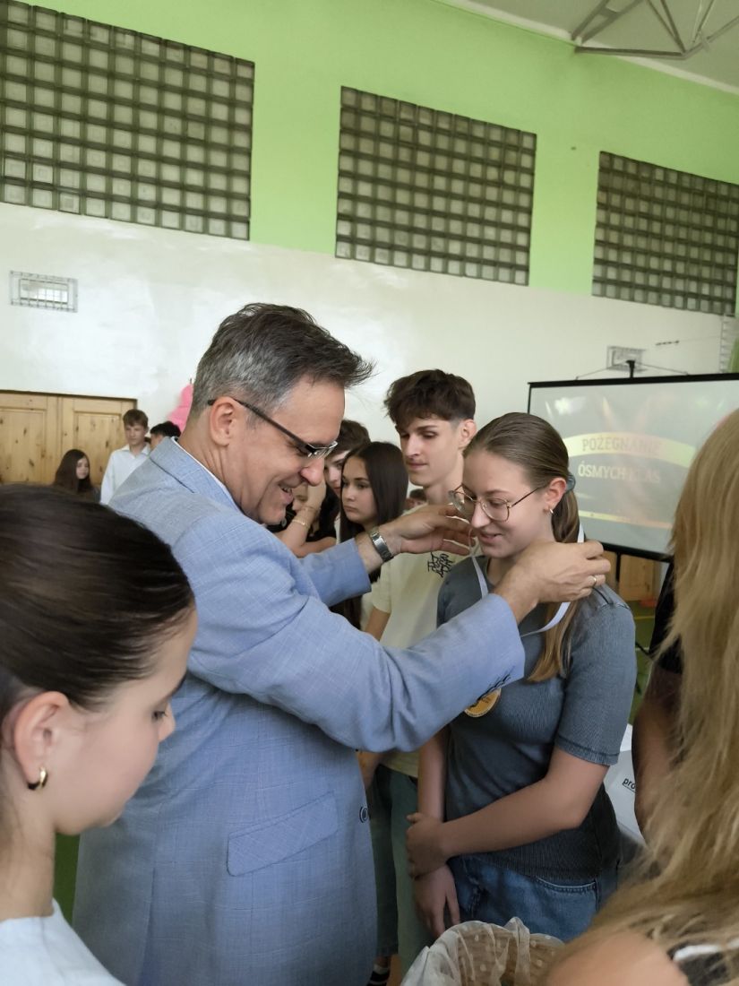 Kluczowym momentem uroczystości było wręczenie pamiątkowych medali przez p. dyrektora Marcina Janasika uczniom klas ósmych. Następnie głos zabrał p. dyrektor, który w swoim przemówieniu m.in. podkreślił zaangażowanie młodzieży w życie szkoły, a jego słowa, pełne ciepła i motywacji, zostały nagrodzone gorącymi brawami.