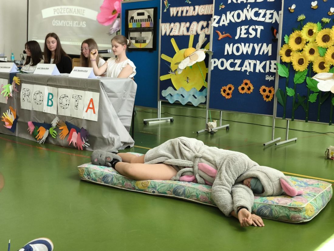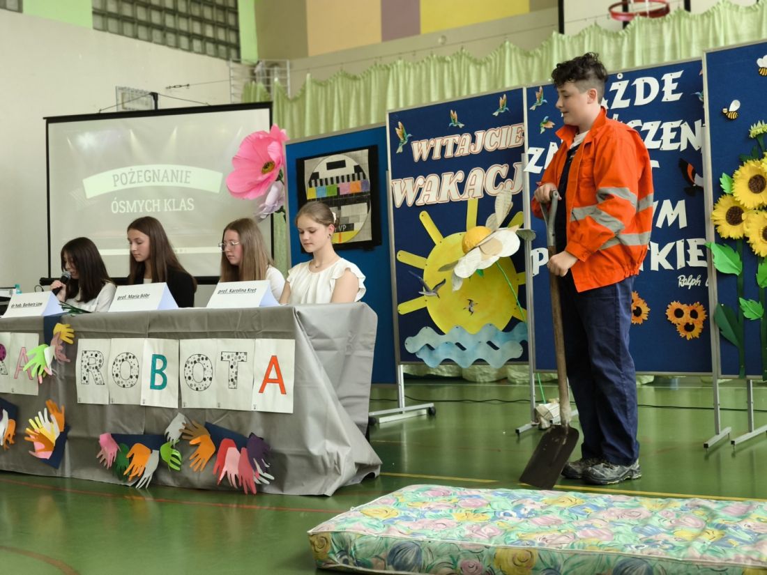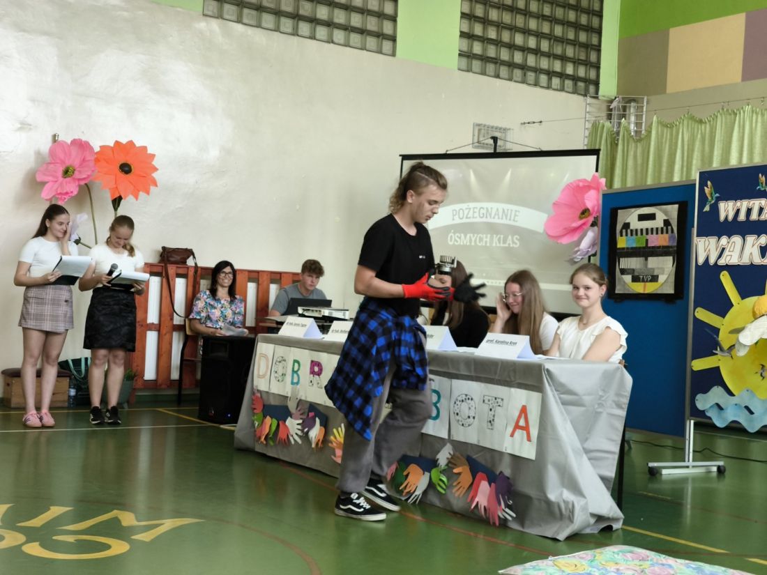 Serdeczne pożegnanie absolwentów przez ich młodszych kolegów – przedstawicieli klas siódmych, rozpoczęło się od humorystycznego przedstawienia na postawie autorskiego scenariusza p. Małgorzaty Nalepy pt. „Dobra robota”, w którym przedstawiono kilka zawodów, na które w niedalekiej przyszłości pojawi się zapotrzebowanie na rynku pracy.