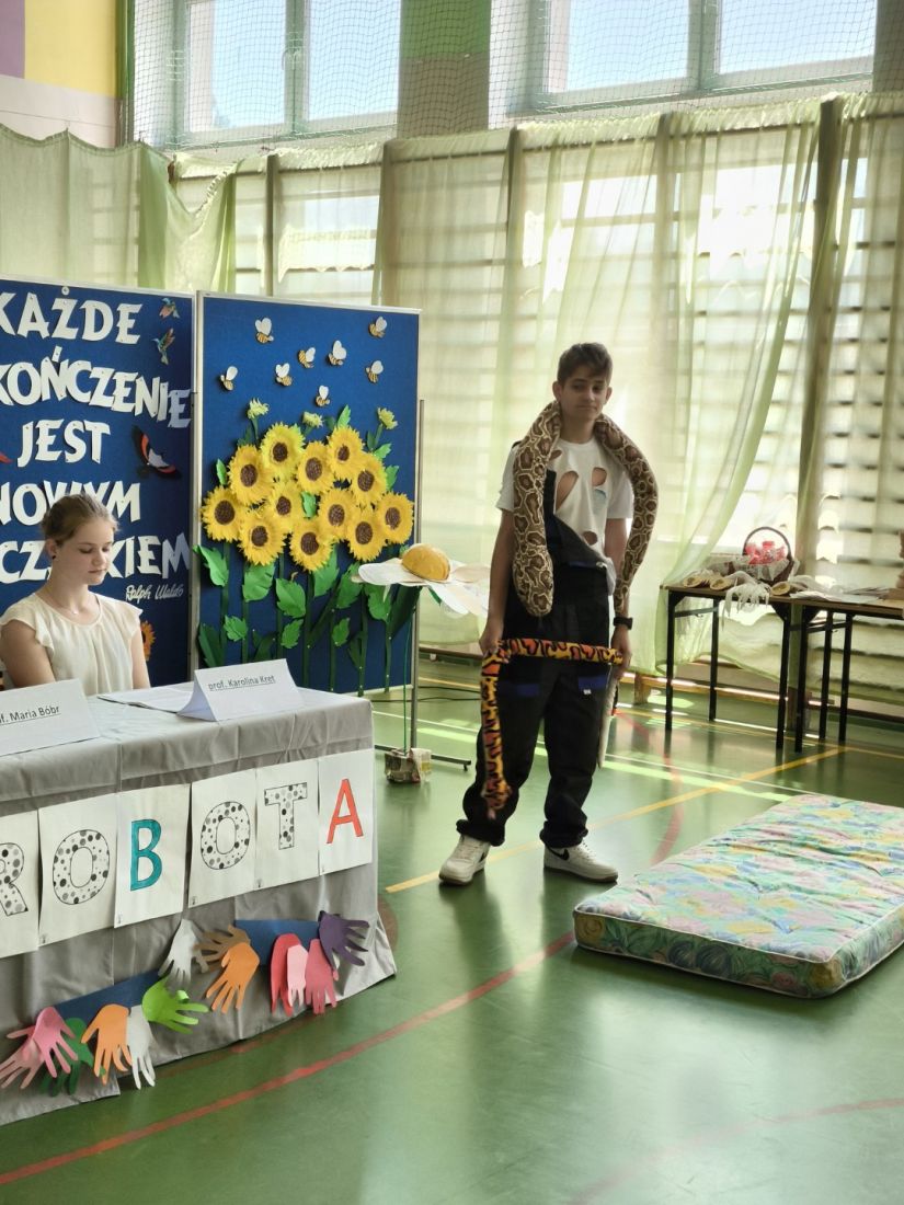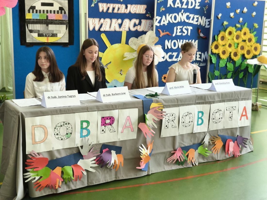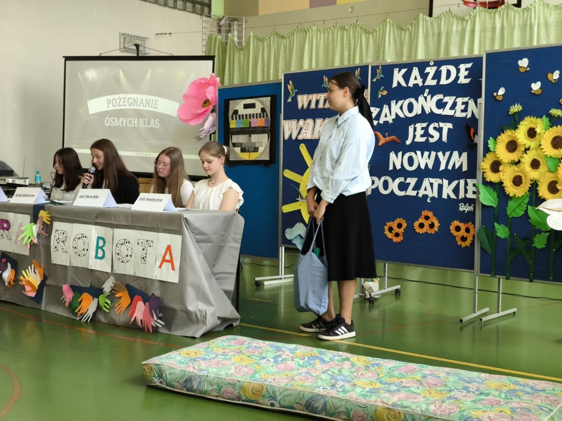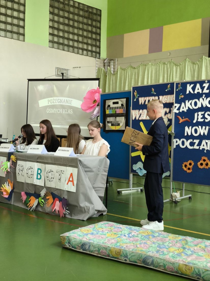 Serdeczne pożegnanie absolwentów przez ich młodszych kolegów – przedstawicieli klas siódmych, rozpoczęło się od humorystycznego przedstawienia na postawie autorskiego scenariusza p. Małgorzaty Nalepy pt. „Dobra robota”, w którym przedstawiono kilka zawodów, na które w niedalekiej przyszłości pojawi się zapotrzebowanie na rynku pracy.