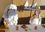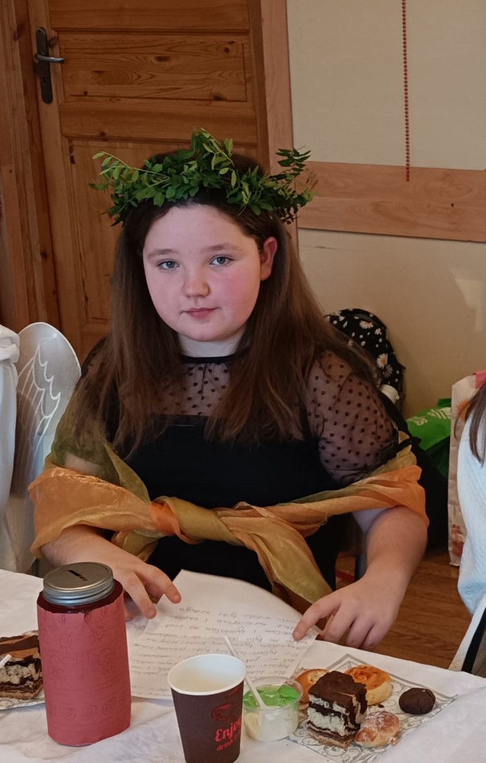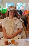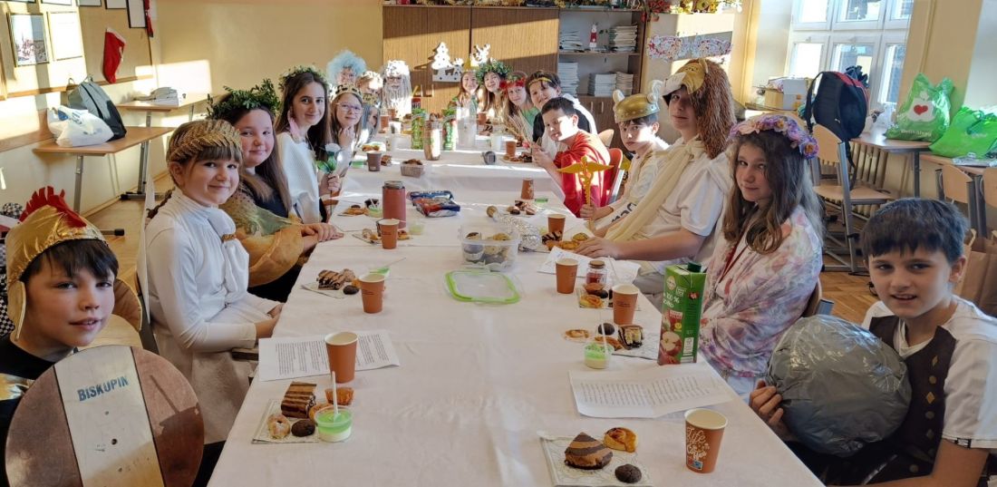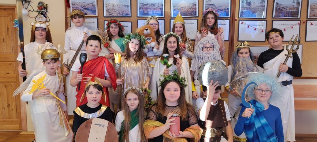 W ramach podsumowania lekcji na temat mitologii greckiej w klasie 5b odbyła się uczta na Olimpie. W sali nr 20 pojawili się bogowie i herosi. Był Zeus i Hera, Uranos i Gaja, Kronos i Rea oraz wielu innych, nie zabrakło także Prometeusza, Heraklesa czy Syzyfa. Uczestnicy opowiadali o sobie, prezentowali stroje i atrybuty, spożywali ambrozję oraz pili nektar.