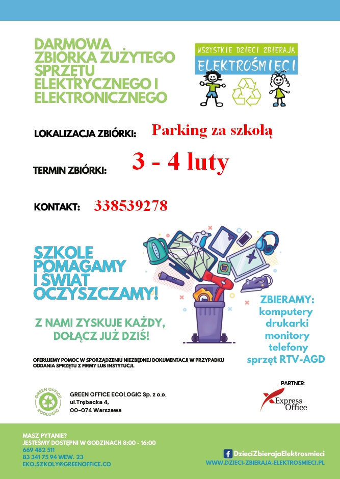 Nasza szkoła ponownie przystąpiła do bardzo udanego projektu ekologicznego „Wszystkie Dzieci Zbierają Elektrośmieci”. Celem akcji jest podniesienie świadomości ekologicznej oraz zwrócenie uwagi na prawidłowe gospodarowanie odpadami.