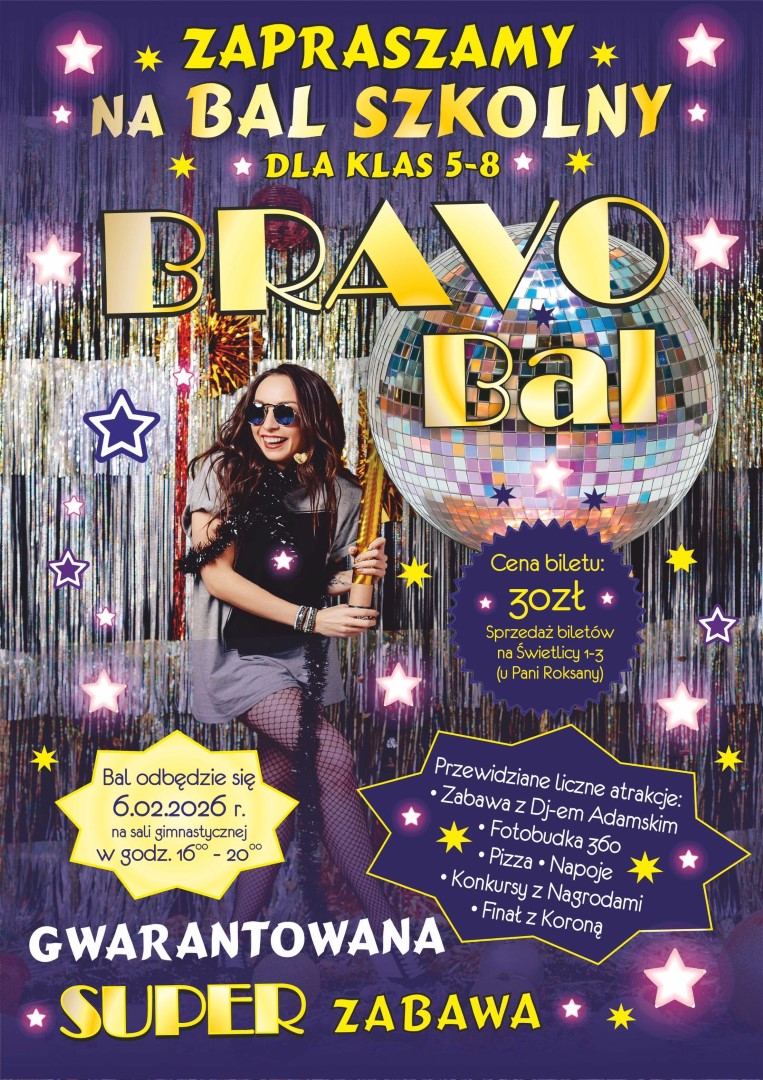 Zaproszenie na Bravo BalAktualności » Zaproszenie na Bravo Bal2026-01-15...Oj, będzie zabawa! Będzie się działo!Serdecznie zapraszamy Uczniów naszej szkoły z klas 5-8 na tegoroczny BRAVO BAL